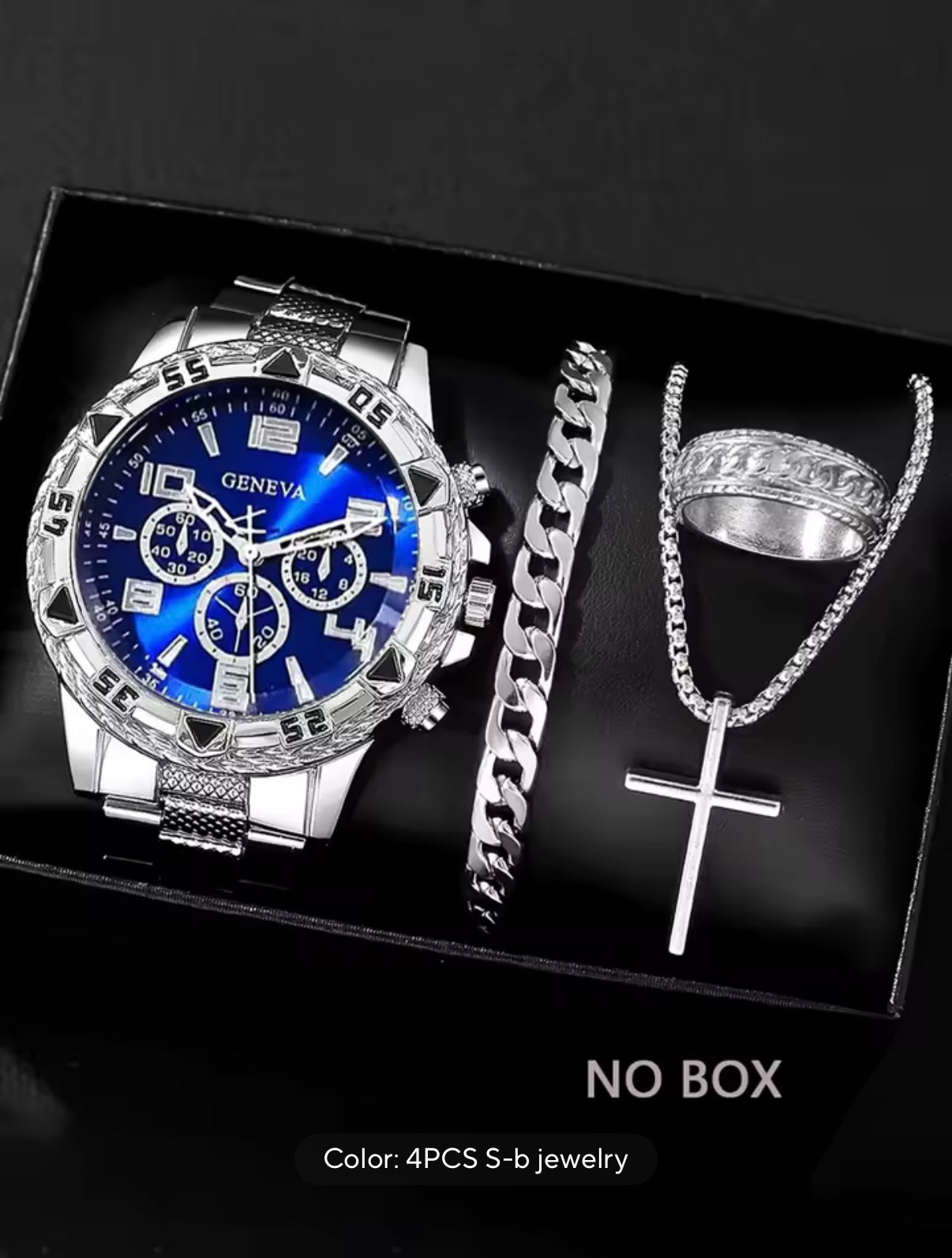 Surprise him with the ultimate gift: a luxurious gold alloy men’s watch and jewelry set. Perfect for birthdays, anniversaries, or special occasions—this complete set includes a stylish quartz watch, matching bracelet, necklace, and ring, all designed for everyday elegance.